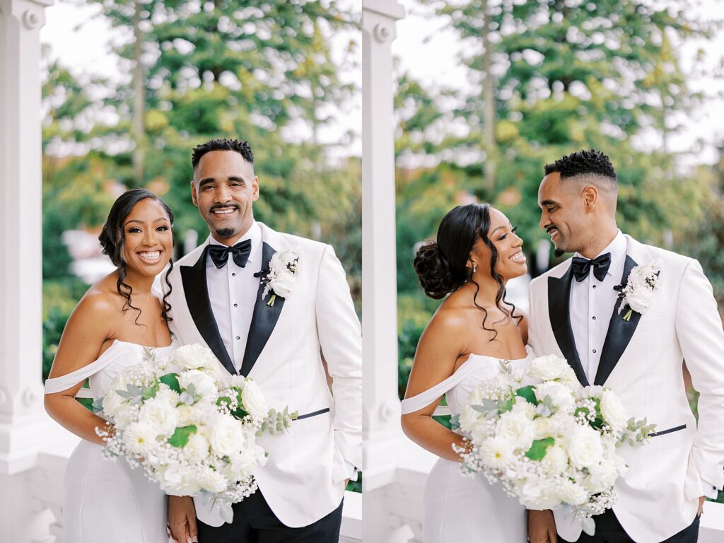 Black couple portrait on the front steps of the Merrimon-Wynne house wedding photographed by Casie Marie Photography