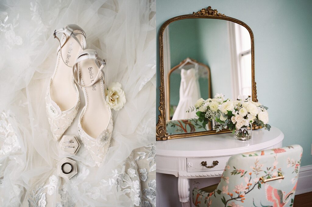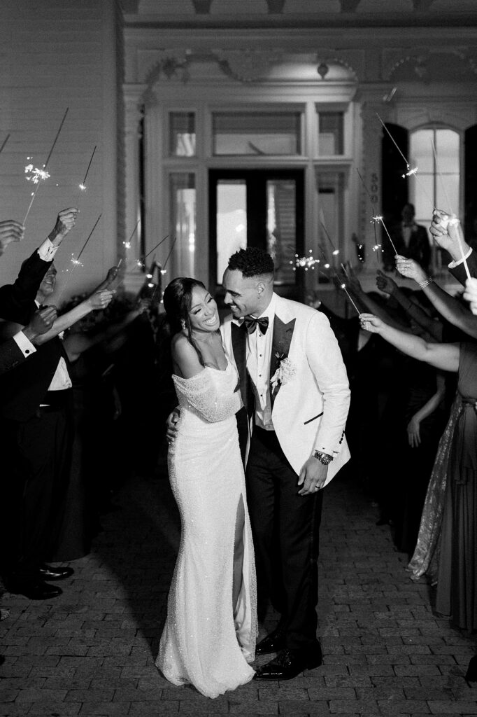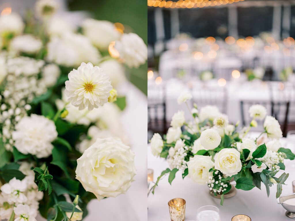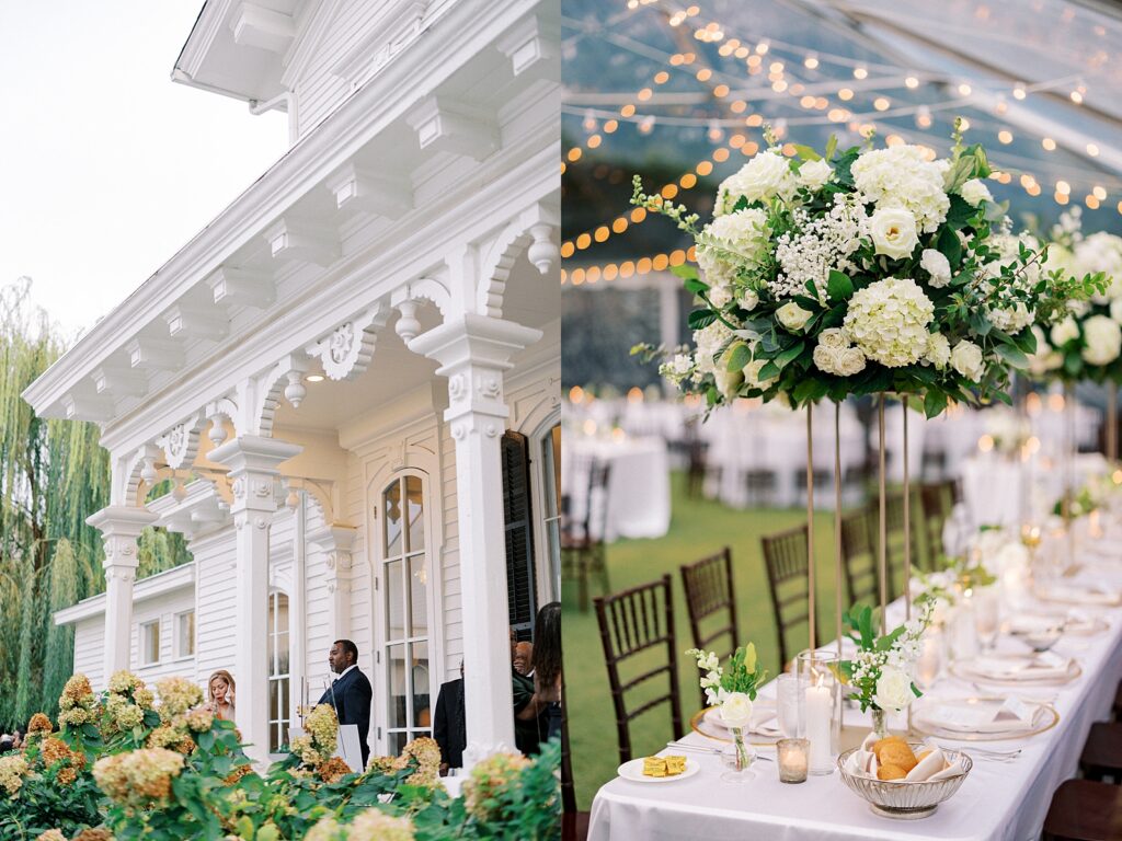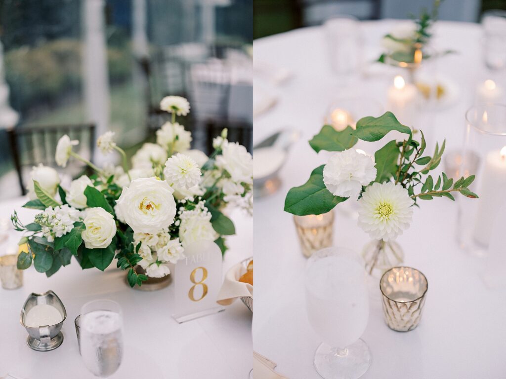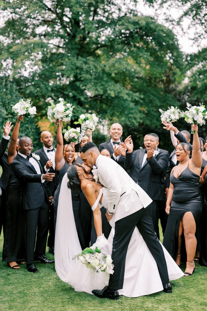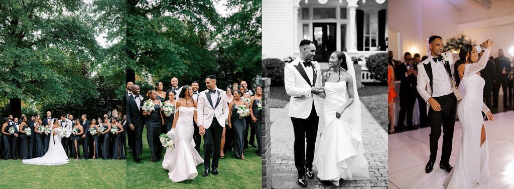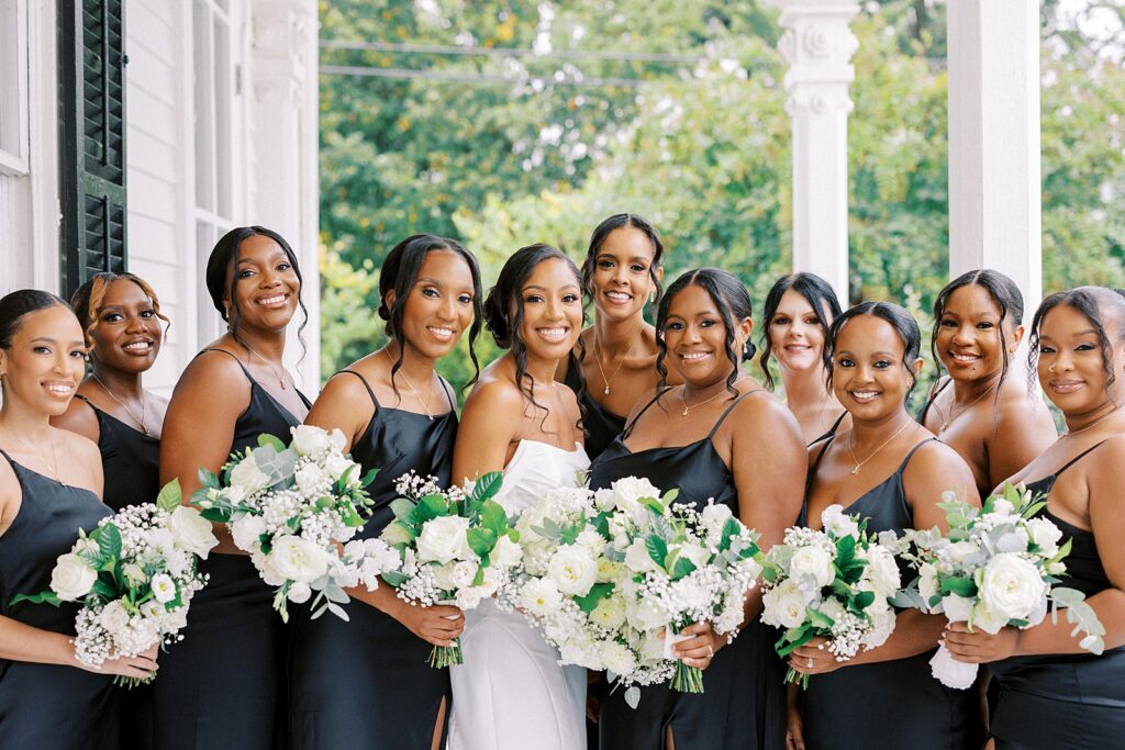 From the beginning of wedding planning, they envisioned a celebration that felt classic, timeless, and sophisticated. Their color palette of white florals and lush greenery, accented with champagne and gold details, paired beautifully with black bridesmaid dresses. The design perfectly complemented the historic architecture of the Merrimon-Wynne House, enhancing the romantic atmosphere of their Raleigh fall wedding.