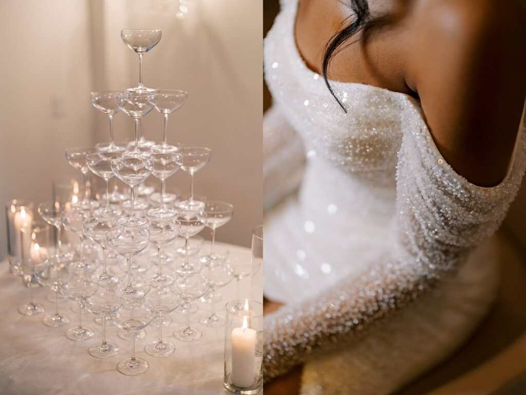 Cocktail hour featured thoughtful details that reflected their family-centered values. A champagne tower added a celebratory flair, while framed photos of their parents’ wedding days were displayed alongside other treasured family memories. Guests enjoyed a vintage audio guestbook and a photo booth that brought a nostalgic, playful energy to the evening.